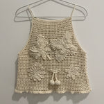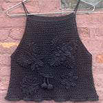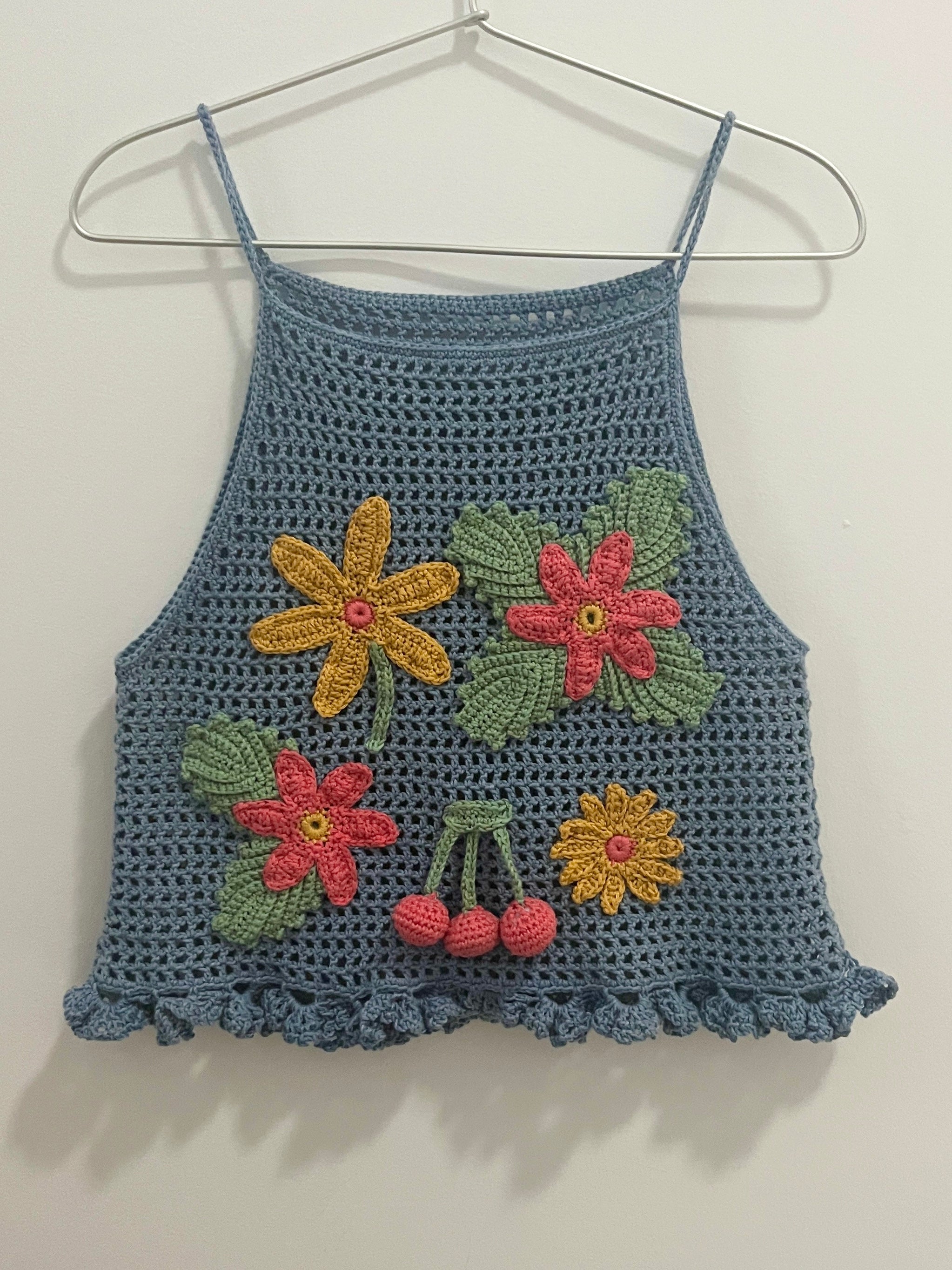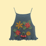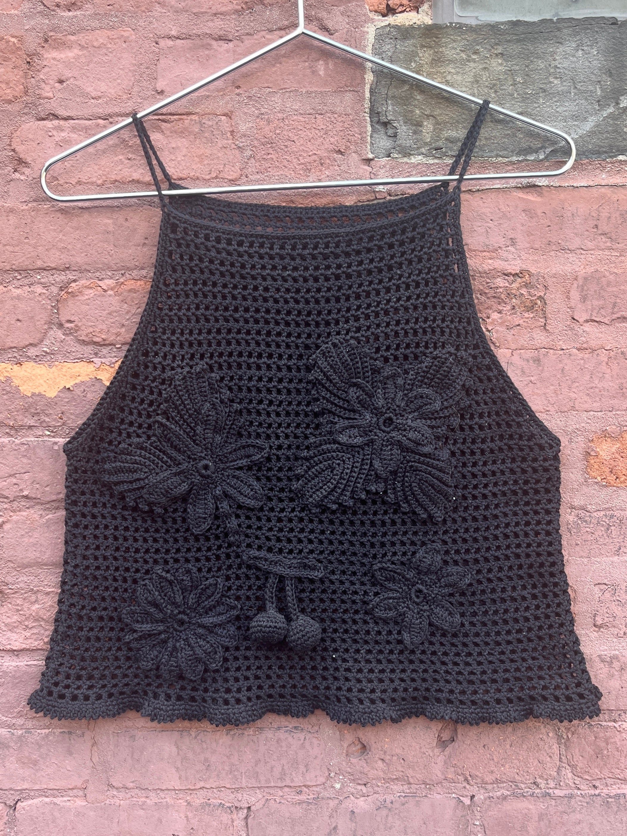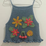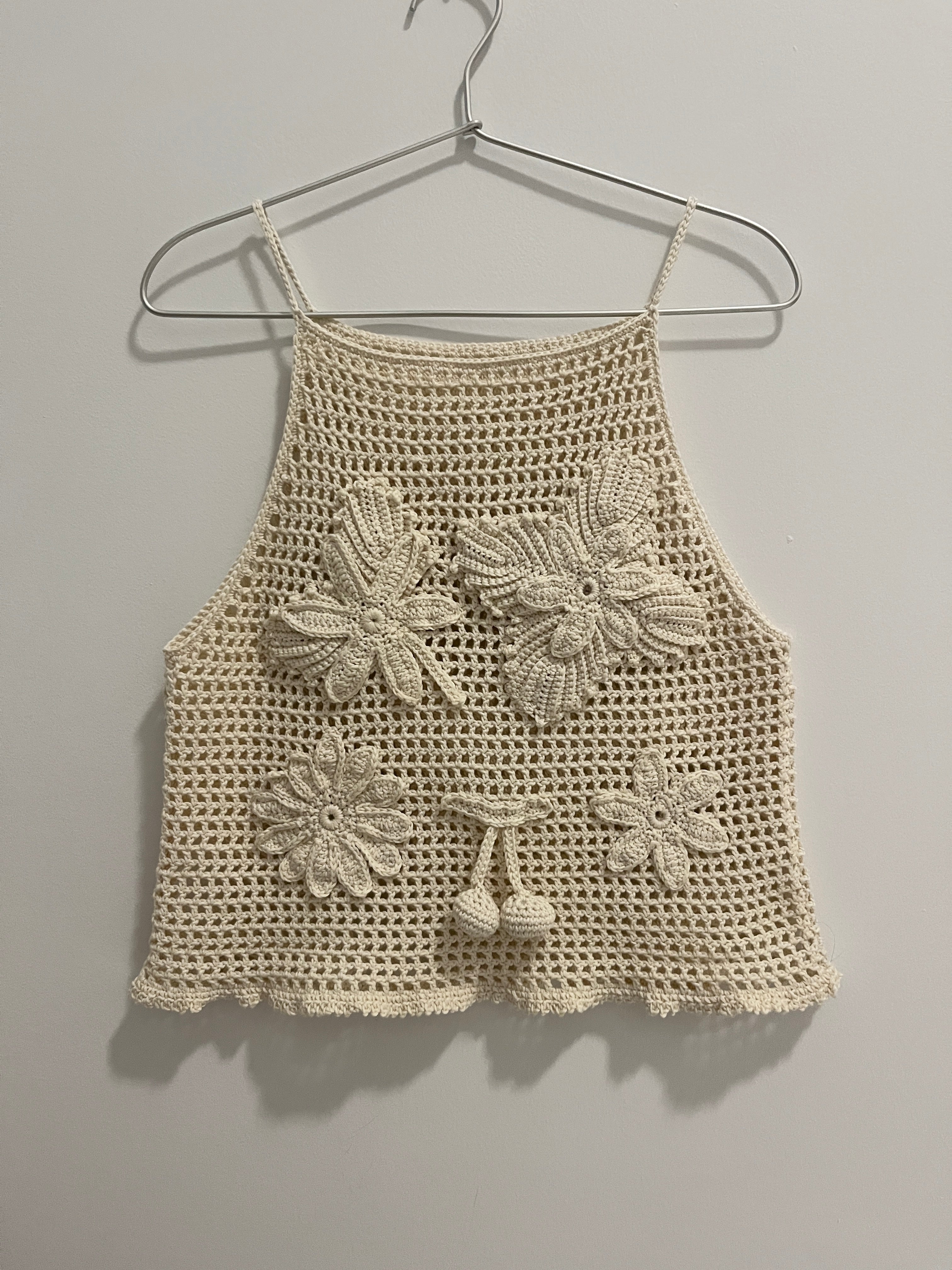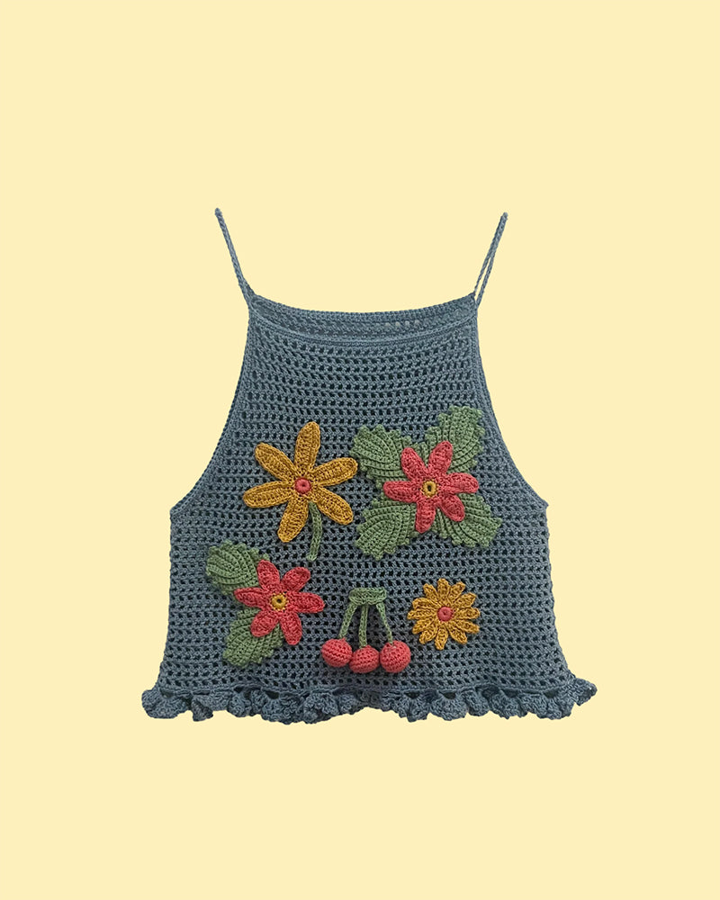 Crafted from cotton, The Garden Tank starts as a basic filet crochet top but is elevated to a luxurious piece with the addition of intricate Irish crochet motifs across the front. The construction process involves working the front, back, and motifs separately before attaching the motifs, seaming the sides, and adding borders and straps. Two yarn options are provided.